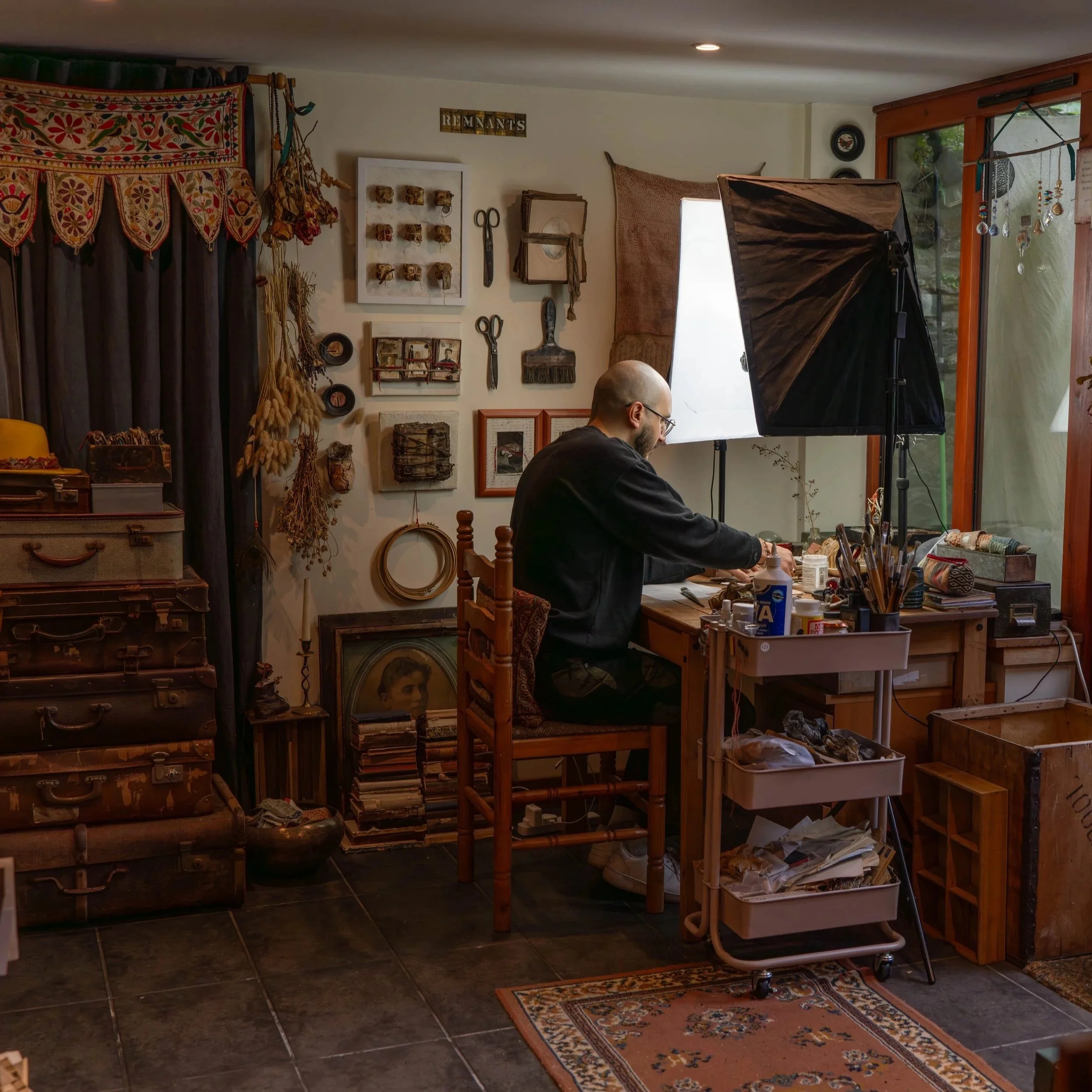 I make collage and assemblage art from found objects, battered papers, discarded photographs, and the materials most people walk past. These things arrive with their own histories already written into them. Stains, cracks, the traces of other lives. I don't cover those marks. I work with them.