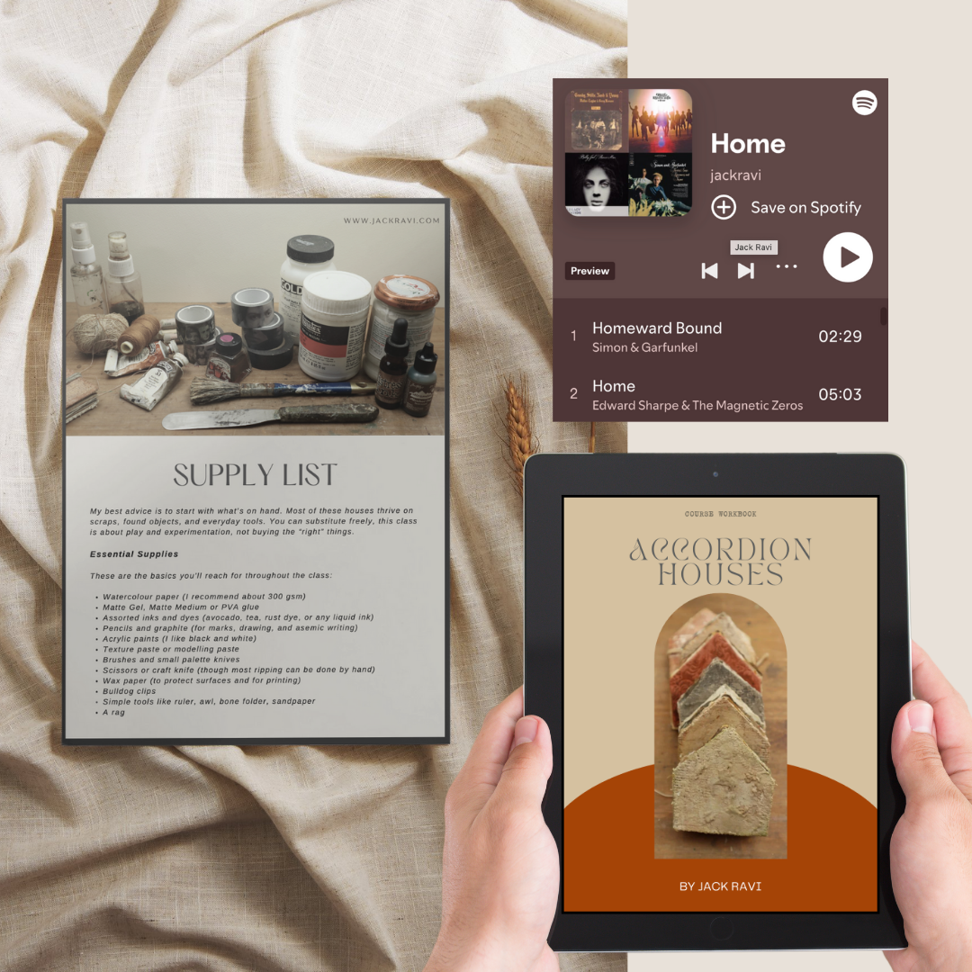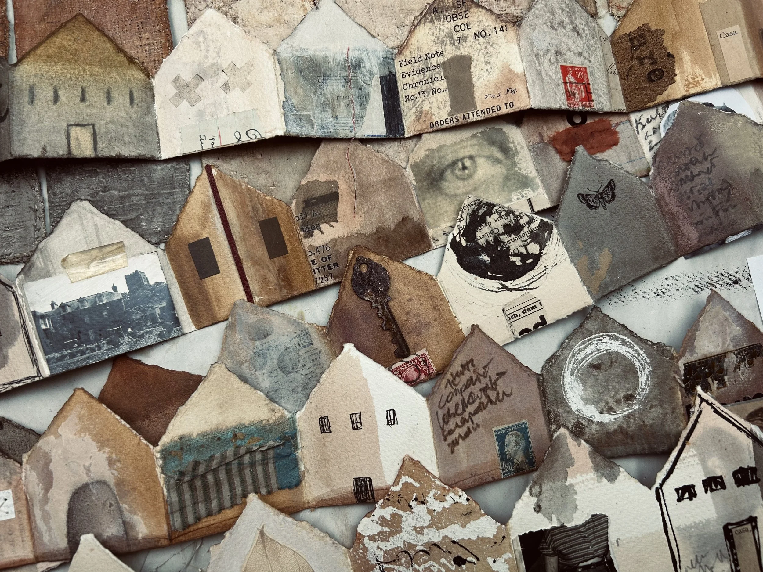 We’ll create a single house-shaped artist book, or an entire village. Each page is a space to experiment with texture, inks, light, and possibility. We’ll work with dyes, gentle mark-making, layered collage, and found objects, letting happy accidents guide the way.