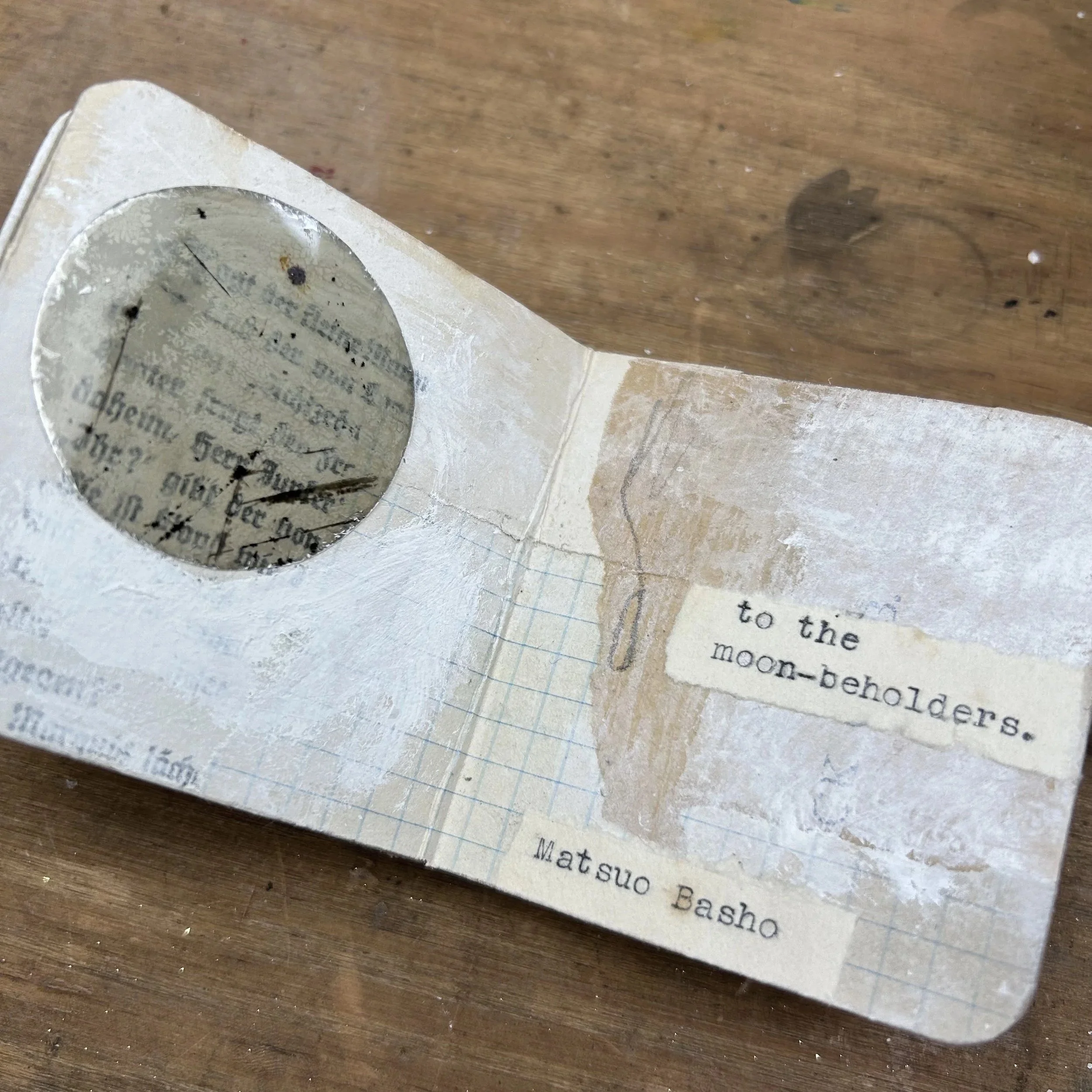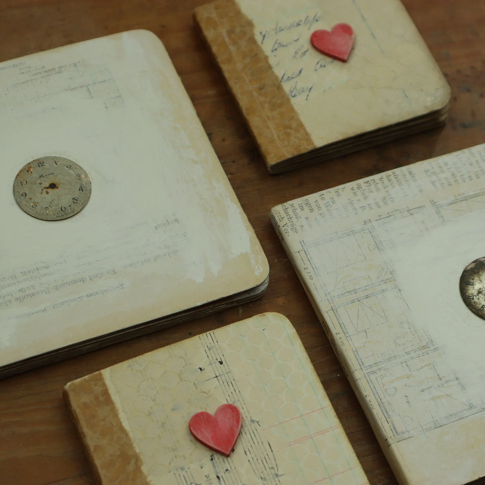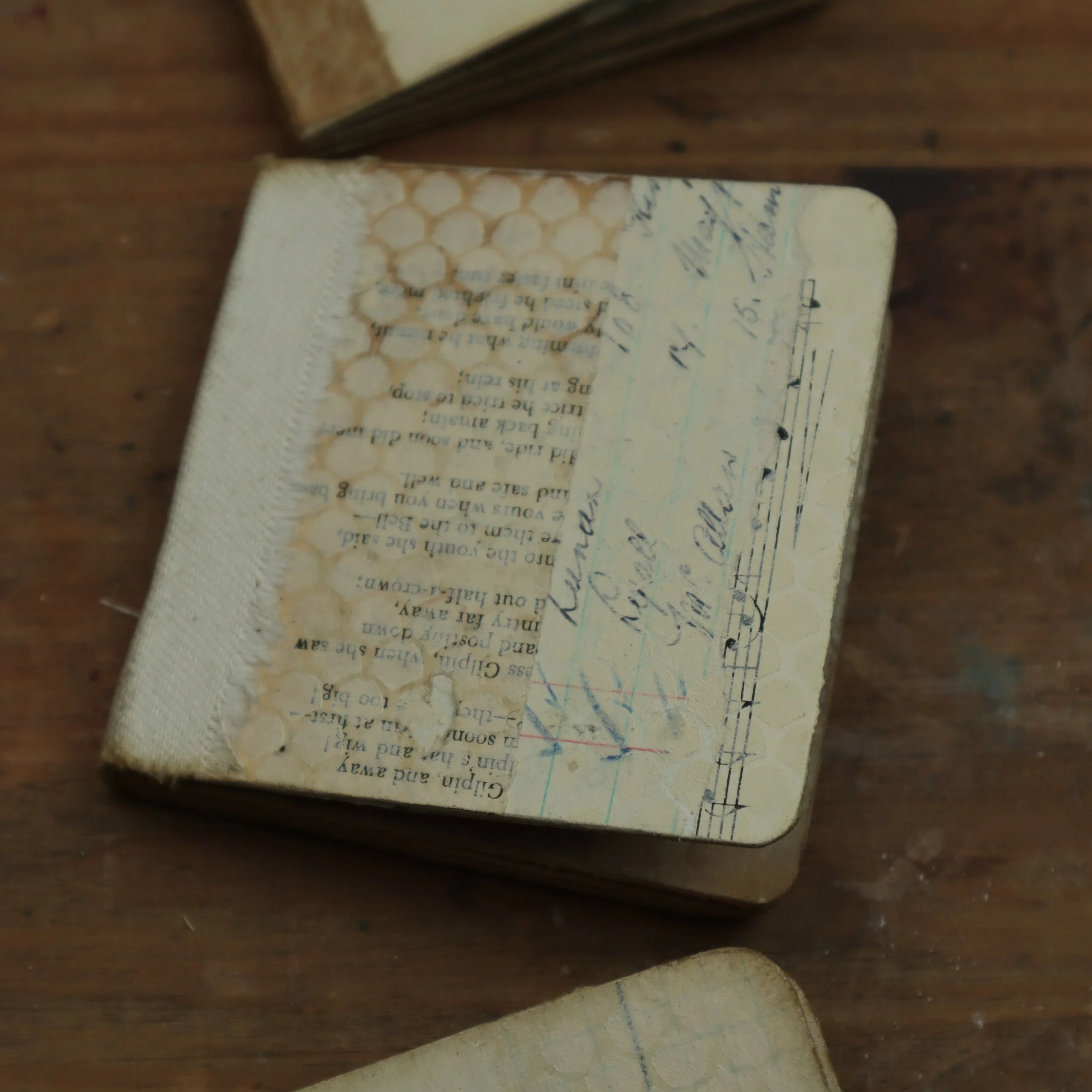 The original pages have been layered, covered, and gently reworked with timeworn materials, creating new surfaces for poetry. Softened edges, muted tones, and worn textures give the books a sense of ancient sacredness.