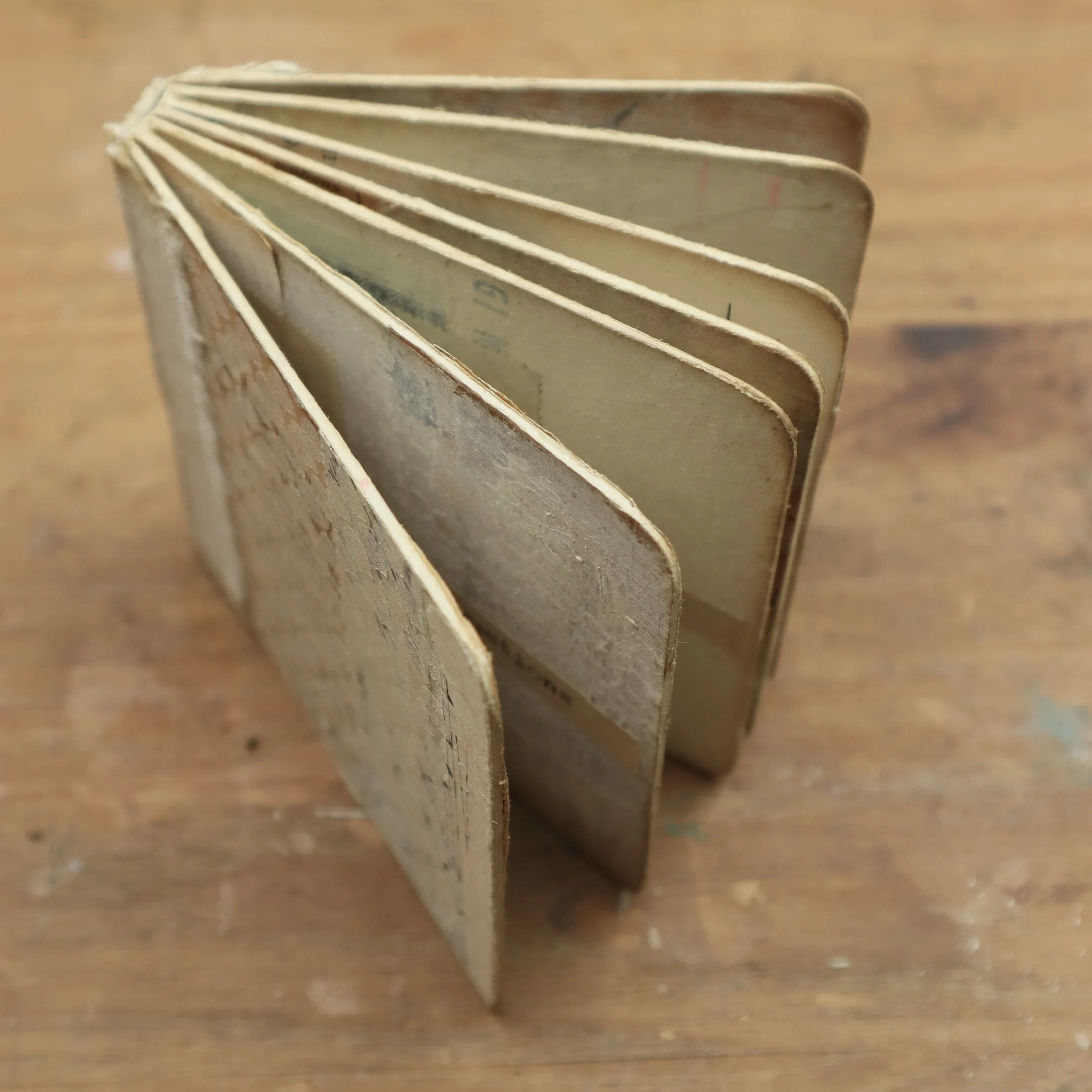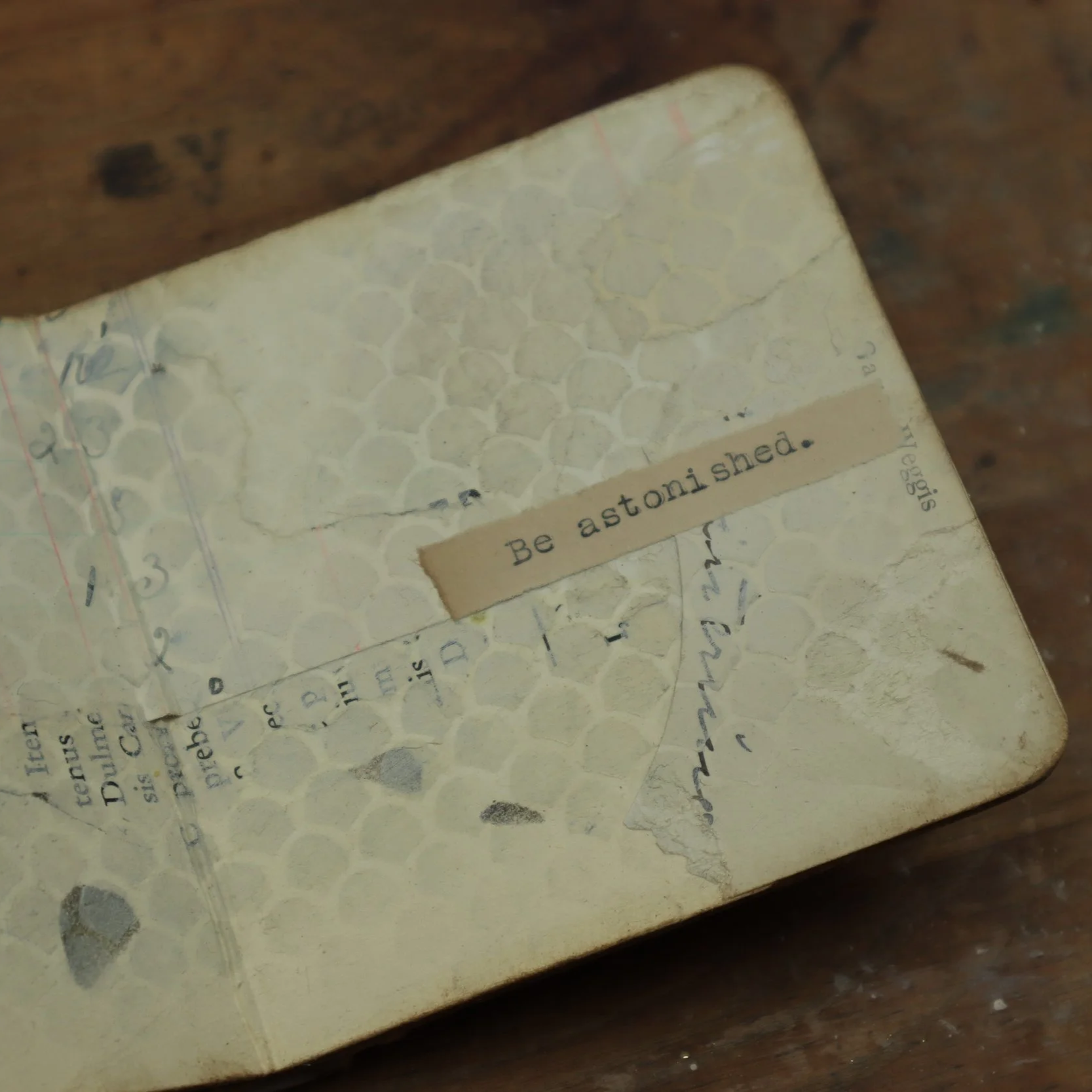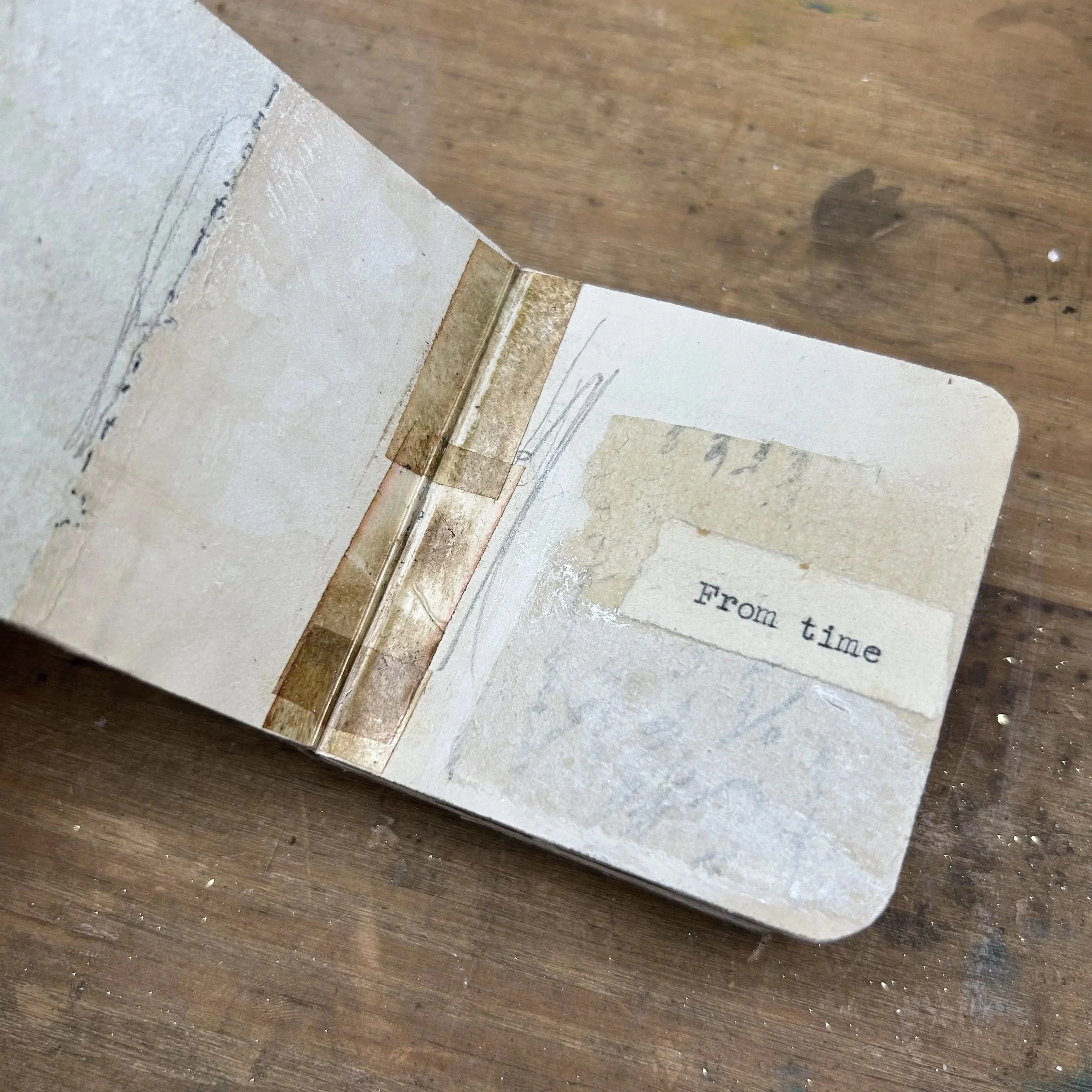 The original pages have been layered, covered, and gently reworked with timeworn materials, creating new surfaces for poetry. Softened edges, muted tones, and worn textures give the books a sense of ancient sacredness.