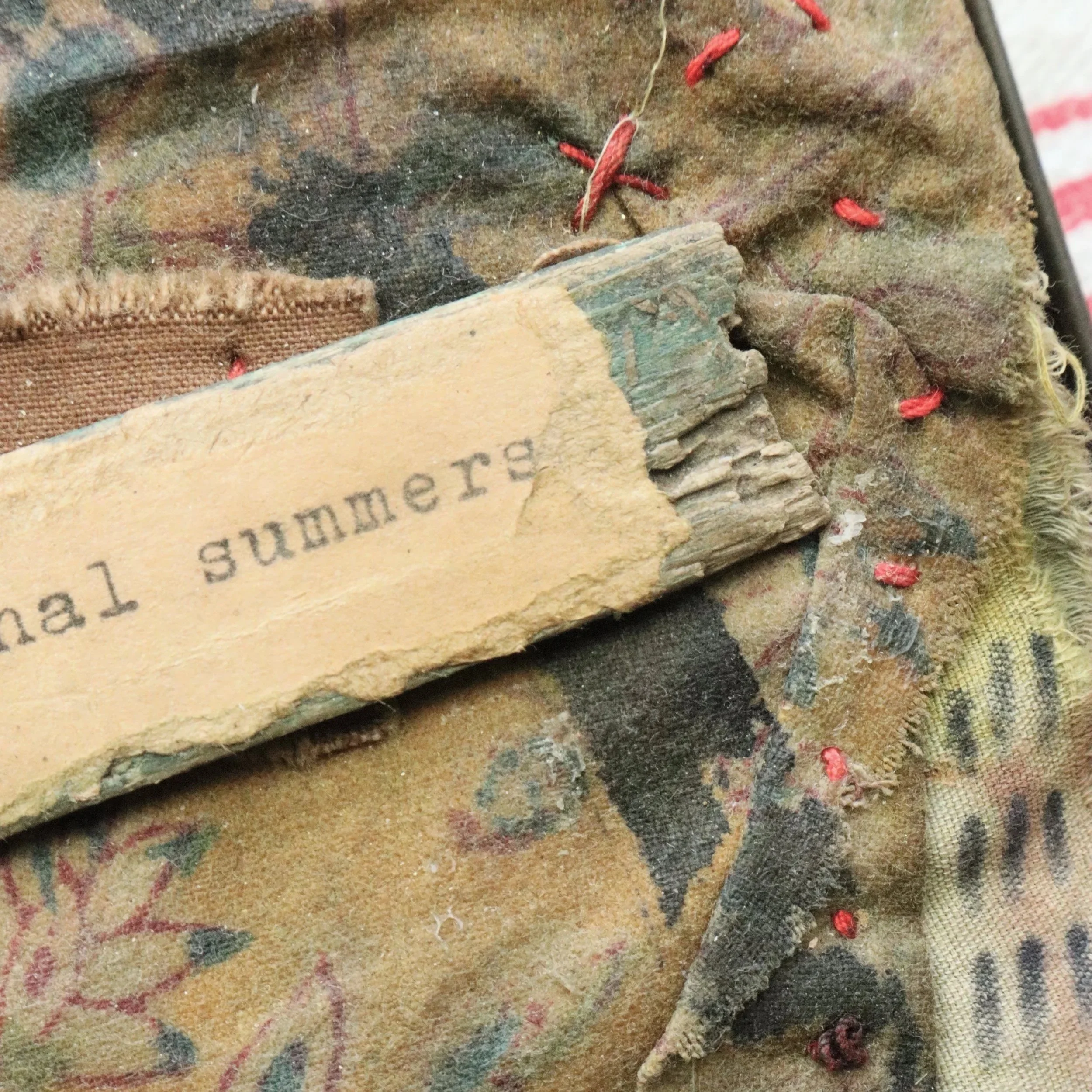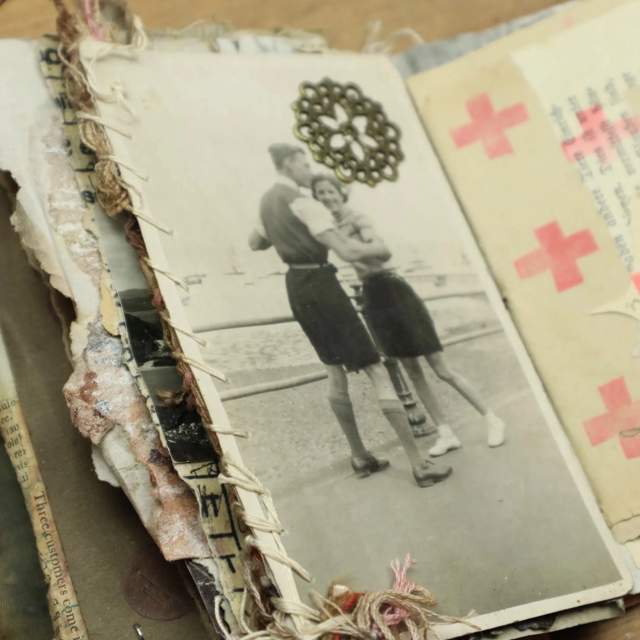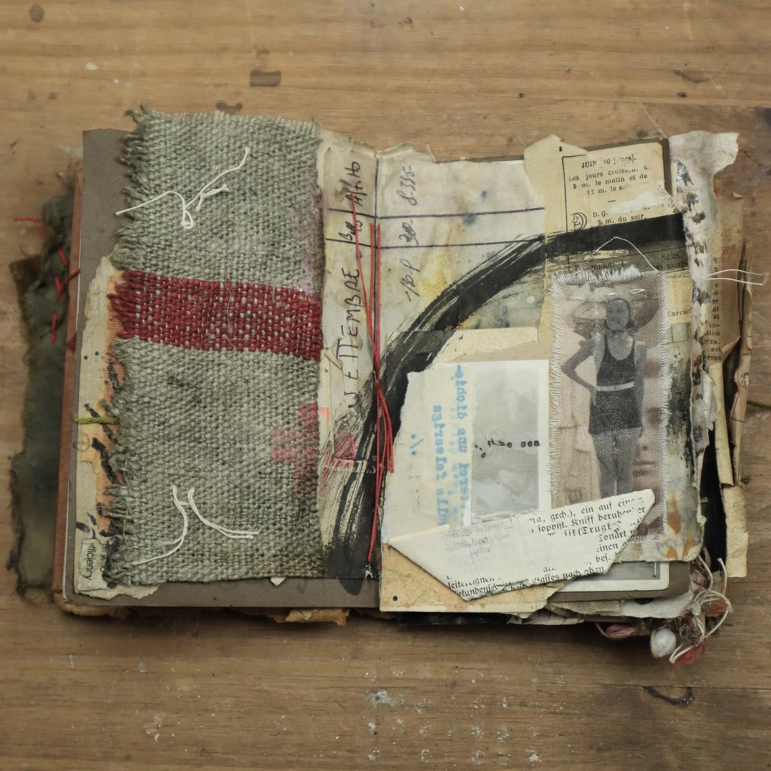 My books are hand-bound, slowly crafted, and never rushed. They grow organically, accumulating meaning over time through layers and layers of paper, fabric, ink, found photographs, and objects, stitched, marked, glued, ripped, burned, collaged, poked, scribbled, and held in quiet devotion. My materials are sourced from the past, to carry their own stories and imperfections, shaped by time, stains, and decay.