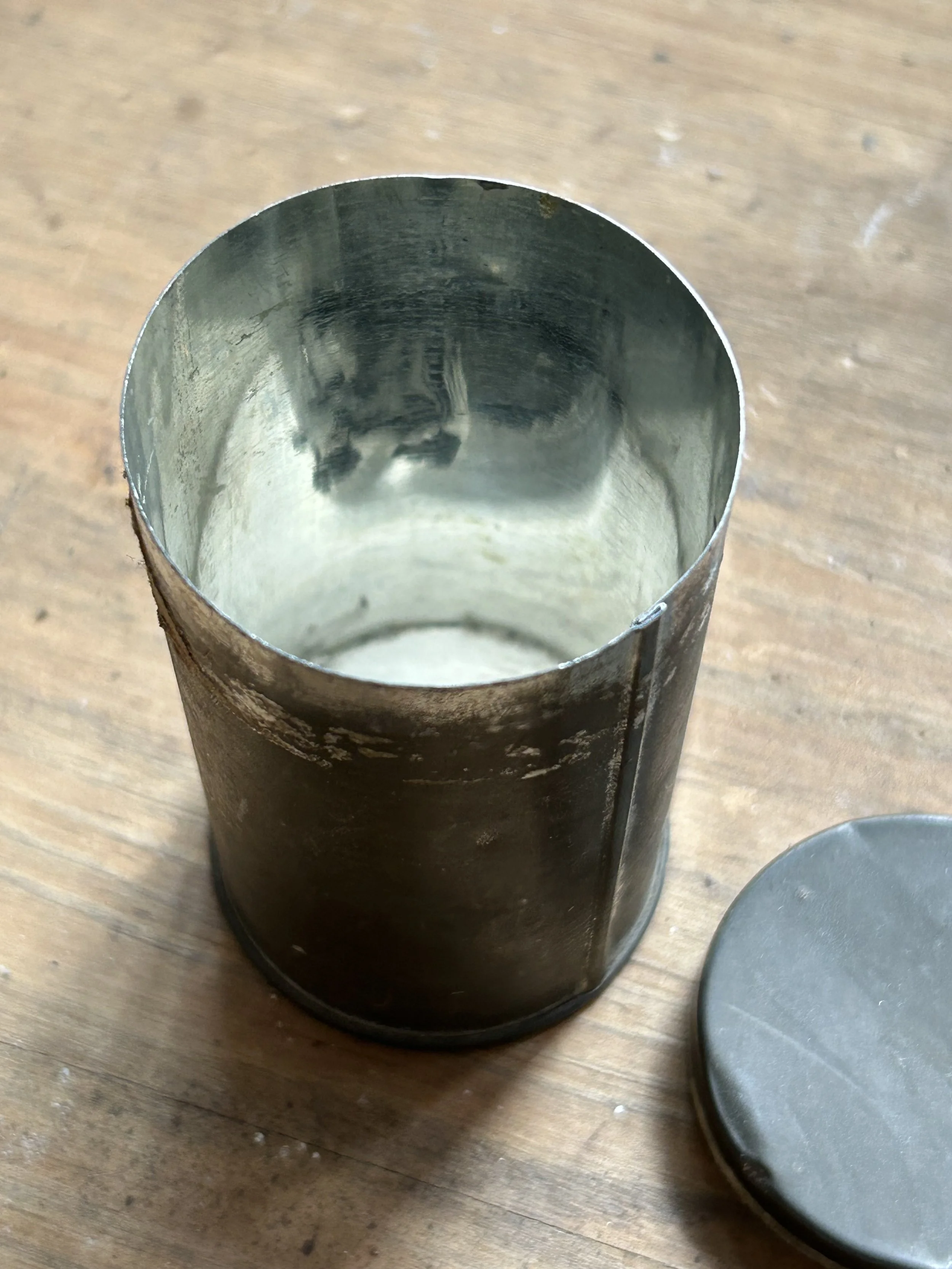 The photograph is delicately enhanced by adding a tiny glass rhinestone to mimic a distant full moon on the horizon. This simple yet poignant alteration infuses the image with a sense of enchantment. The photo is then resized to fit within a found tin, aged and weathered by the passage of time. This tin, with its high walls, becomes a key component of the artwork, playing a dual role as both a container and a canvas. The tin's reflective interior surfaces magically capture and amplify the images and the ambient light, lending the piece an ethereal and ever-changing quality.