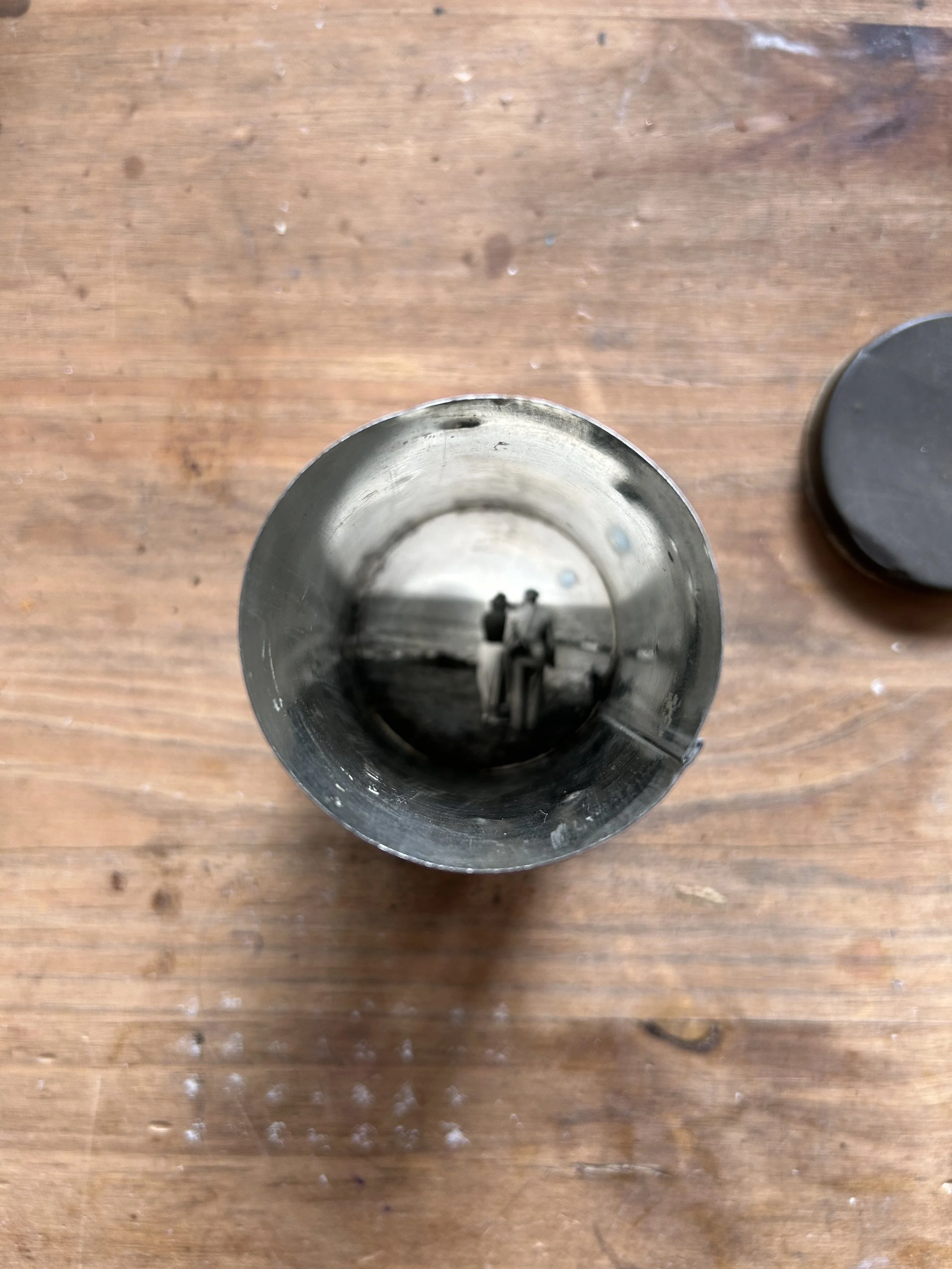 The magic of the tin is that it doesn't merely frame the photograph but it also creates the illusion of looking through binoculars itself. This subtle metamorphosis within the tin alludes to the concept of images within images, resembling natural fractals. This effect evokes a sense of voyeurism, encouraging the viewer to connect with the couple in the photograph who, at some point in time, also gazed upon a distant horizon.