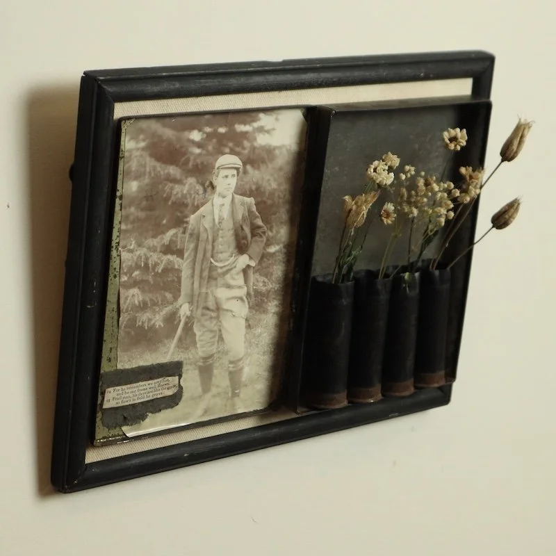This collection takes the backs of antique frames, with their rusty nails and timeworn papers, and transforms them into vessels of expression.