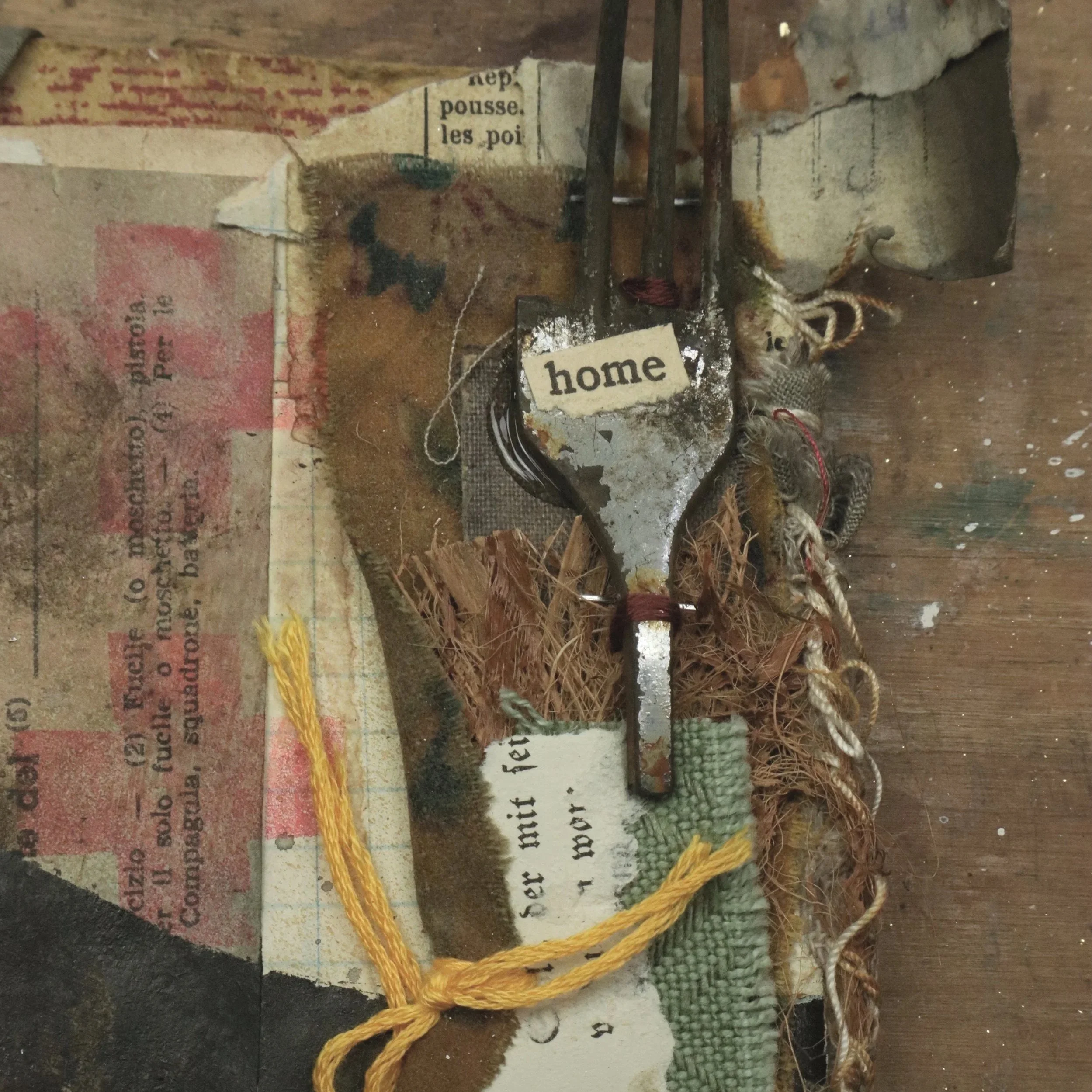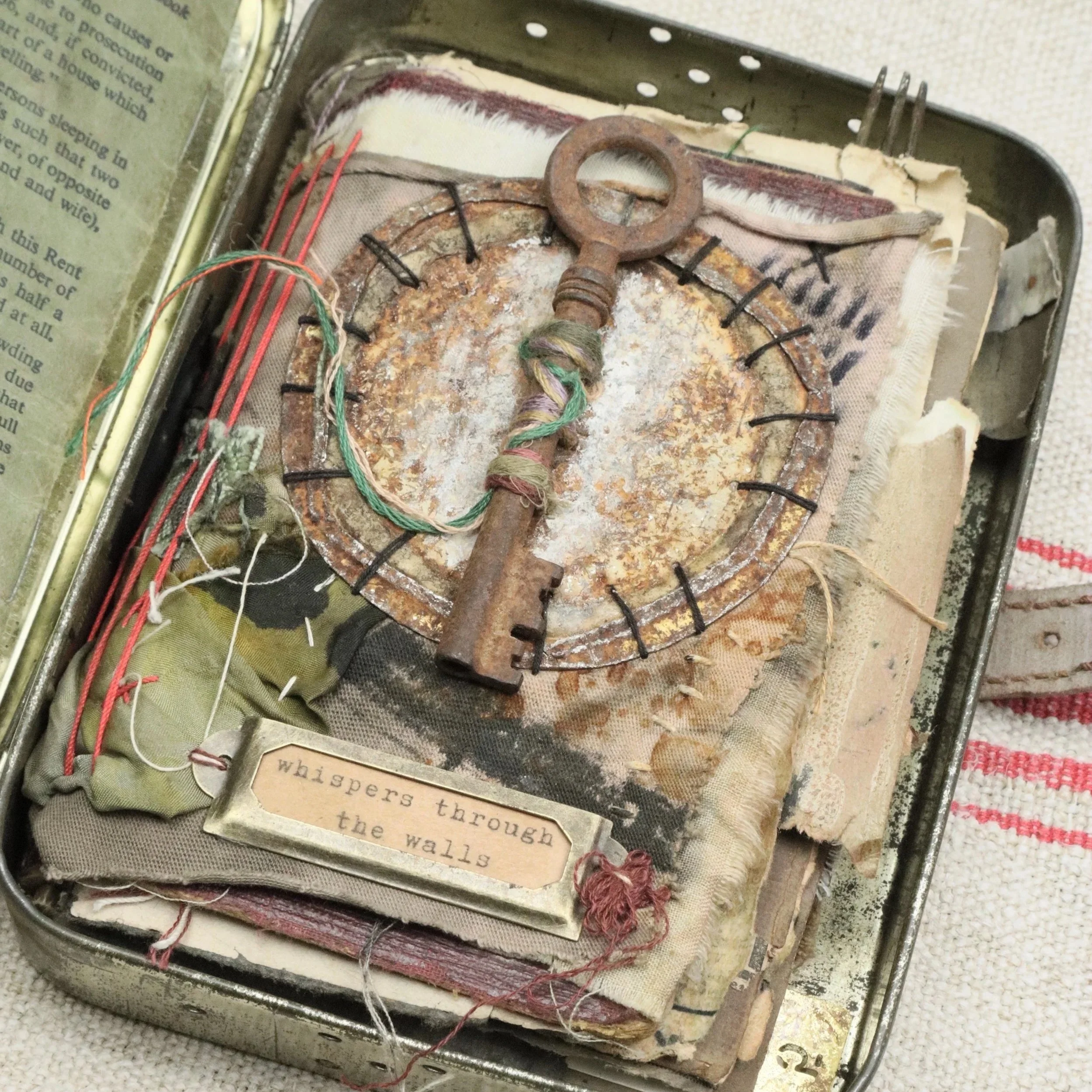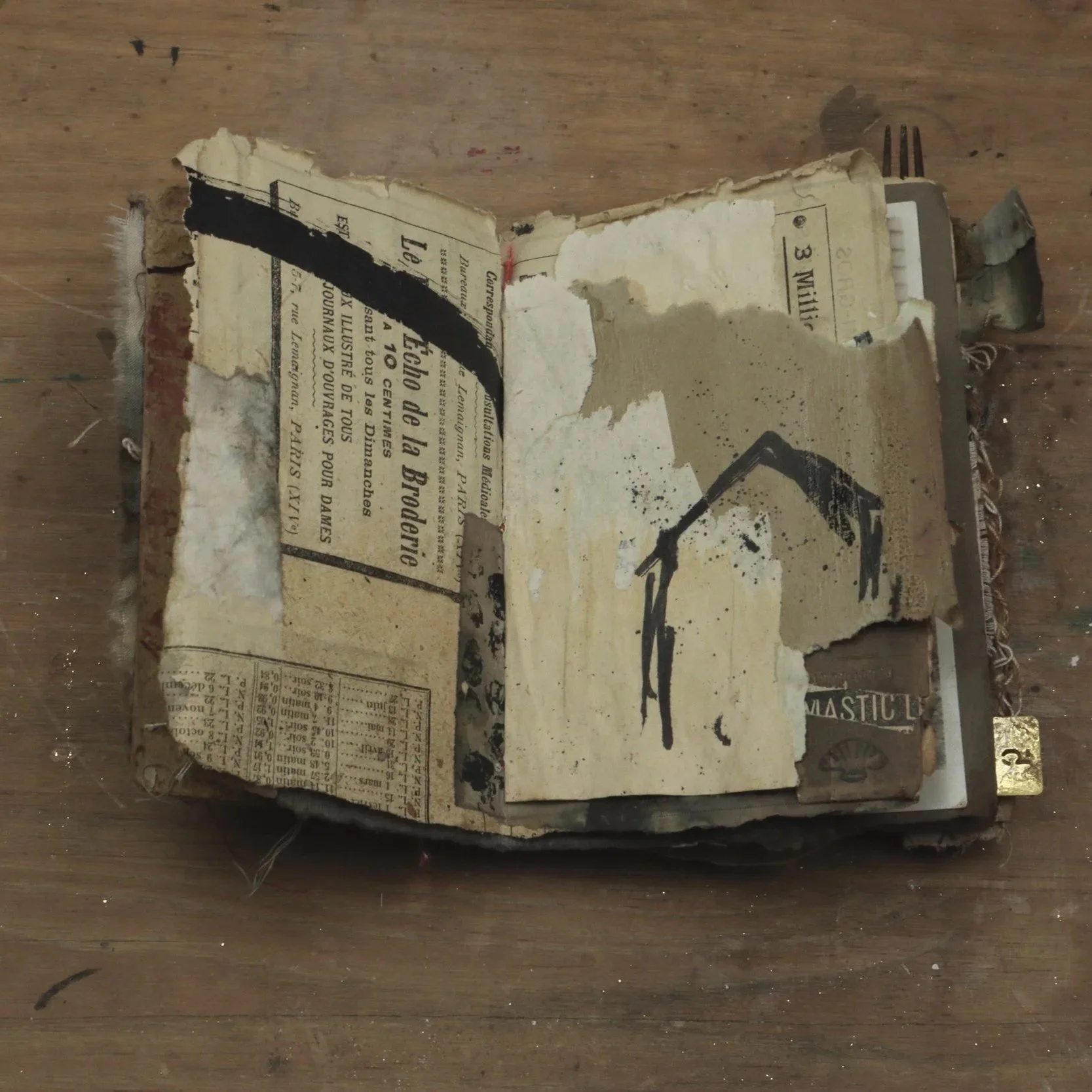My books are hand-bound, slowly crafted, and never rushed. They grow organically, accumulating meaning over time through layers and layers of paper, fabric, ink, found photographs, and objects, stitched, marked, glued, ripped, burned, collaged, poked, scribbled, and held in quiet devotion. My materials are sourced from the past, to carry their own stories and imperfections, shaped by time, stains, and decay.