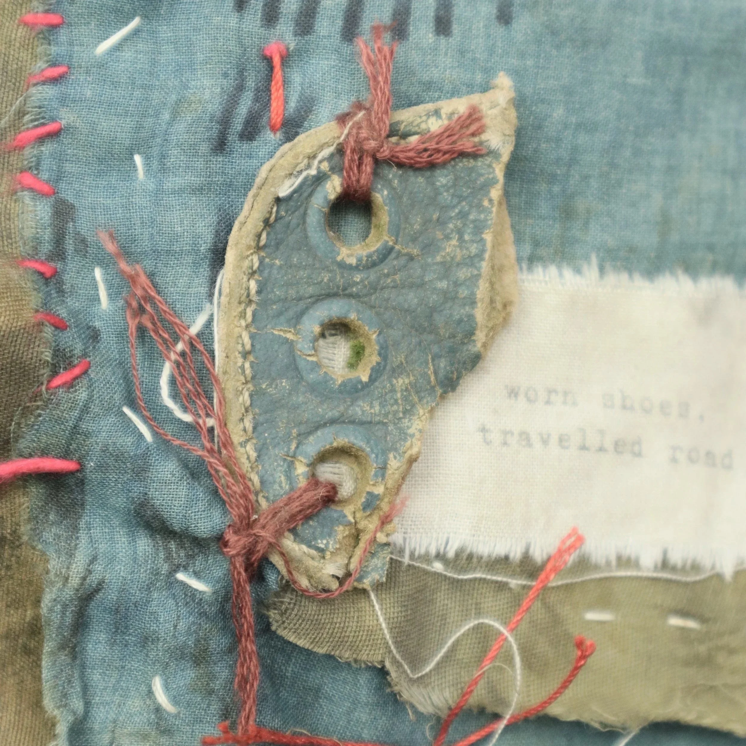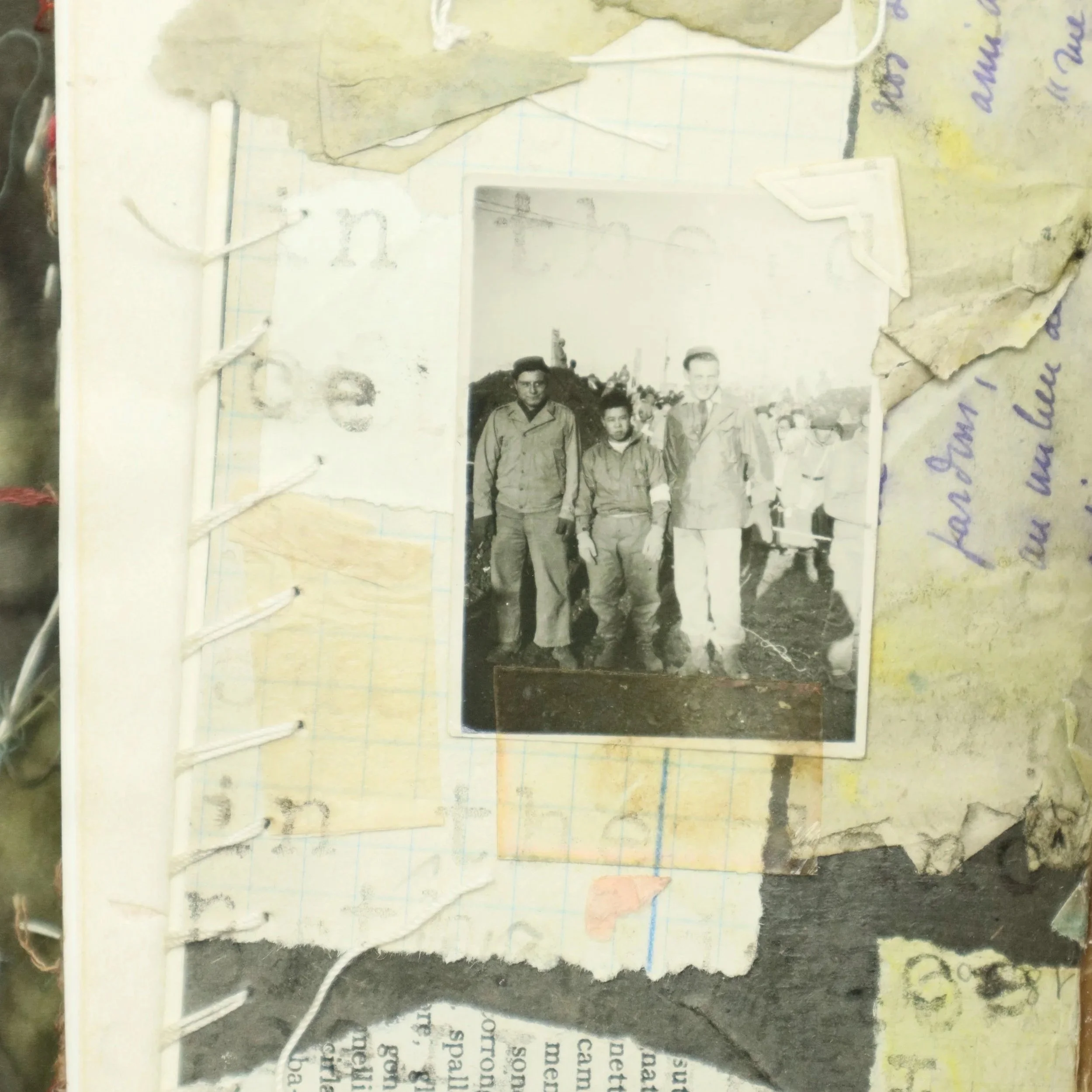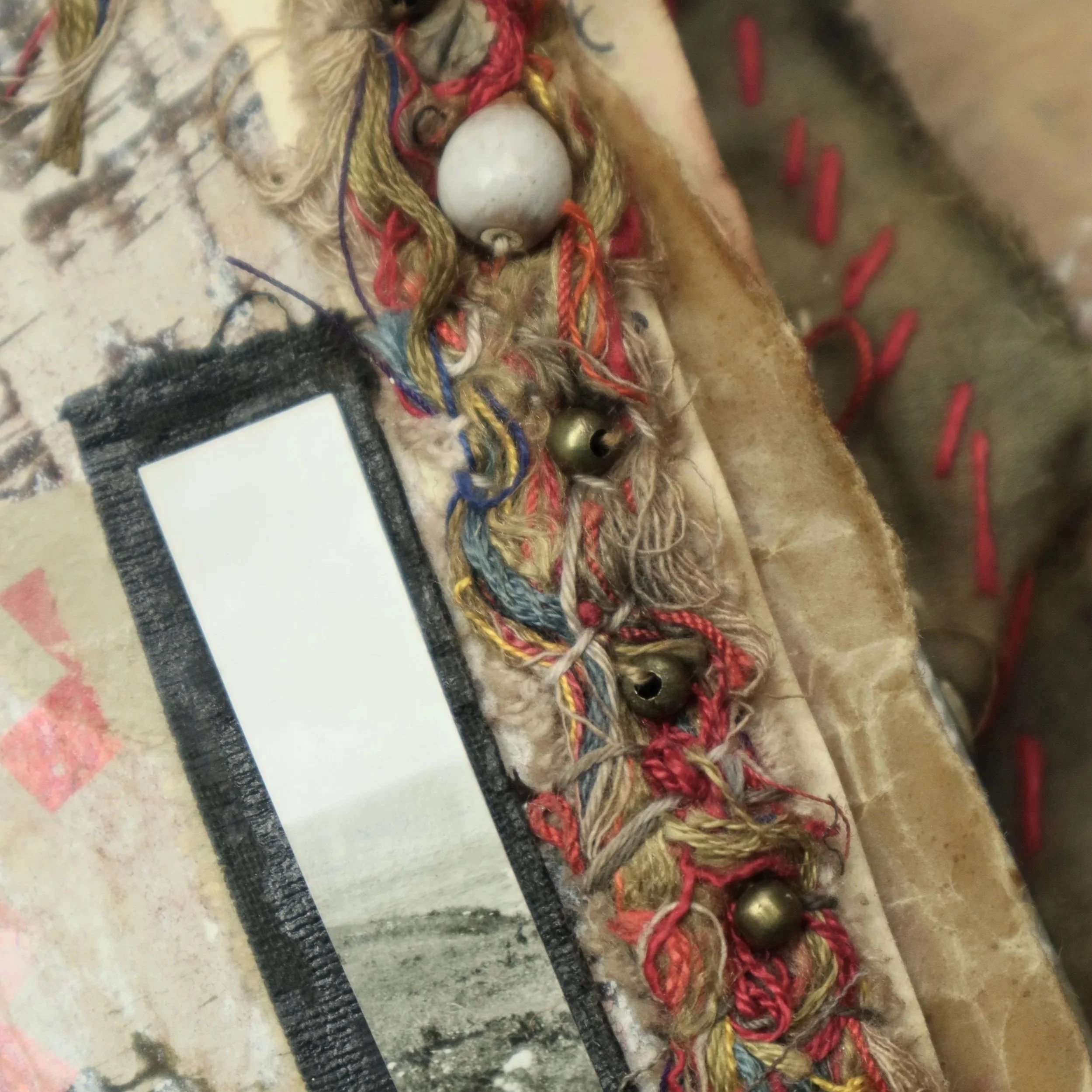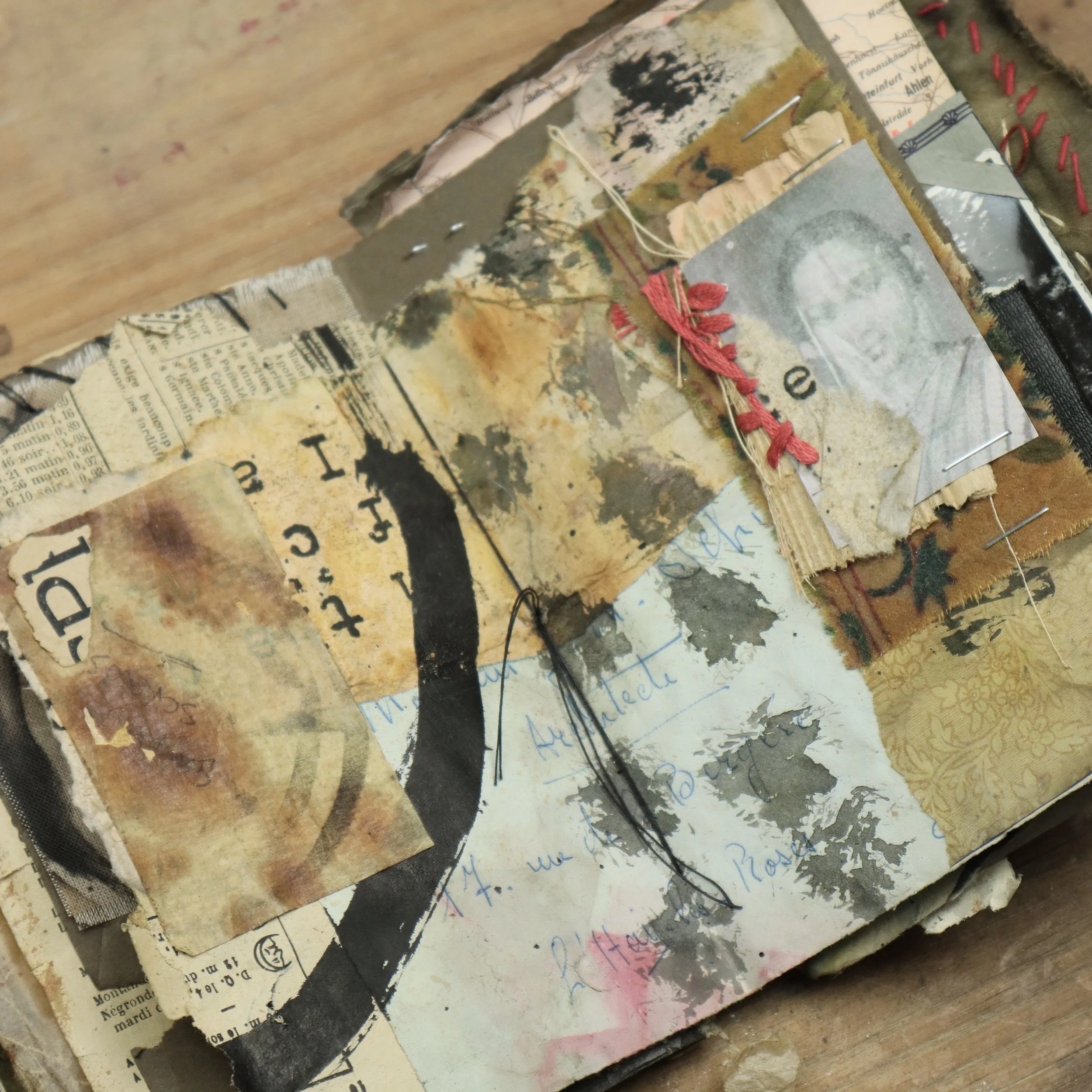 My books are hand-bound, slowly crafted, and never rushed. They grow organically, accumulating meaning over time through layers and layers of paper, fabric, ink, found photographs, and objects, stitched, marked, glued, ripped, burned, collaged, poked, scribbled, and held in quiet devotion. My materials are sourced from the past, to carry their own stories and imperfections, shaped by time, stains, and decay.